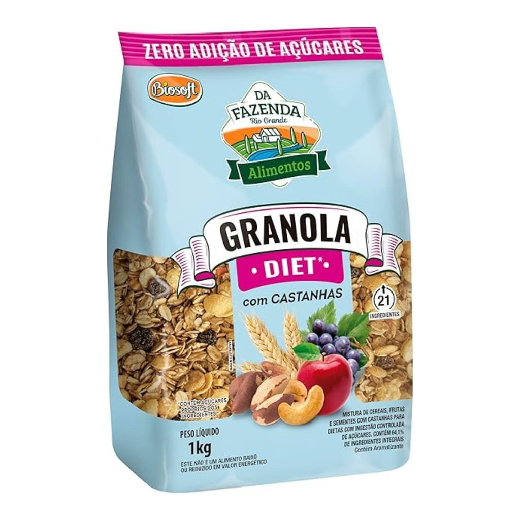 A Granola Diet com Castanhas 1kg Da Fazenda é uma mistura nutritiva e crocante, sem adição de açúcares, ideal para quem segue uma alimentação controlada ou dietas com restrição de açúcar. Elaborada com grãos integrais, aveia, linhaça e castanhas selecionadas, fornece fibras, proteínas e gorduras boas, contribuindo para a saciedade e o equilíbrio nutricional. Perfeita para consumir com frutas, iogurtes ou leite.