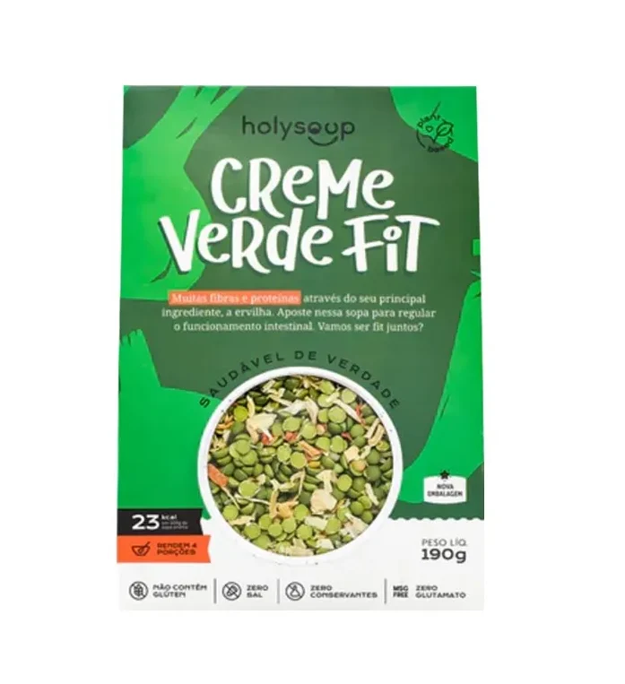 O Creme Verde Fit HolySoup 190g é uma sopa instantânea vegana e sem glúten, elaborada com ingredientes 100% naturais como ervilha desidratada, cenoura, cebola, alho e pimenta-preta em pó. Rica em fibras e proteínas, auxilia na regulação intestinal, promove saciedade e contribui para um emagrecimento saudável. Com apenas 23 kcal por porção de 100g preparada, é uma opção leve e funcional para refeições práticas no dia a dia. Livre de glúten, lactose, conservantes e aditivos químicos, pode conter traços de leite e castanhas. Para preparar, basta adicionar água quente e aguardar alguns minutos.