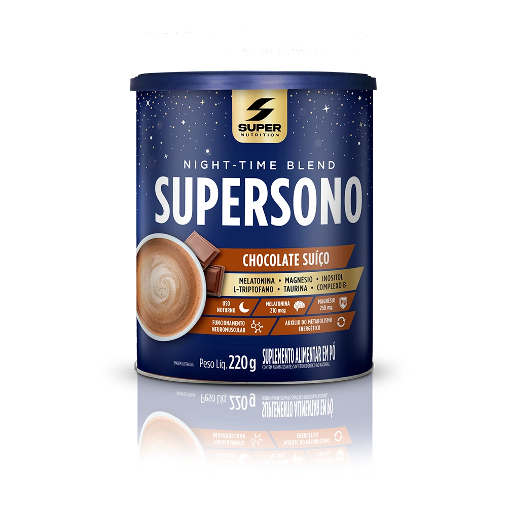 O Supersono Sabor Chocolate Suíço 220g da Super Nutrition é um suplemento noturno em pó desenvolvido para promover um sono de qualidade e restaurador, combinando ingredientes funcionais como 210 mcg de melatonina, 250 mg de magnésio, L-triptofano, inositol, taurina, TCM (triglicerídeos de cadeia média) e um complexo de vitaminas do complexo B, incluindo colina, B1, B2, B5, B6, B9 e B12. Sua fórmula é livre de glúten, soja, açúcares adicionados, corantes e aromatizantes artificiais, sendo adoçada naturalmente com estévia. Cada porção de 10g (2 dosadores) fornece 41 kcal, 3,4 g de carboidratos e 0,7 g de açúcares totais, tornando-se uma opção leve e funcional para o consumo noturno. O preparo é simples: basta dissolver 10g do produto em 100 ml de água quente para obter uma bebida cremosa com sabor de chocolate suíço, ideal para ser consumida cerca de 30 minutos antes de dormir. O Supersono é indicado para adultos e não é vegano, pois pode conter traços de lactose devido a algumas matérias-primas utilizadas.