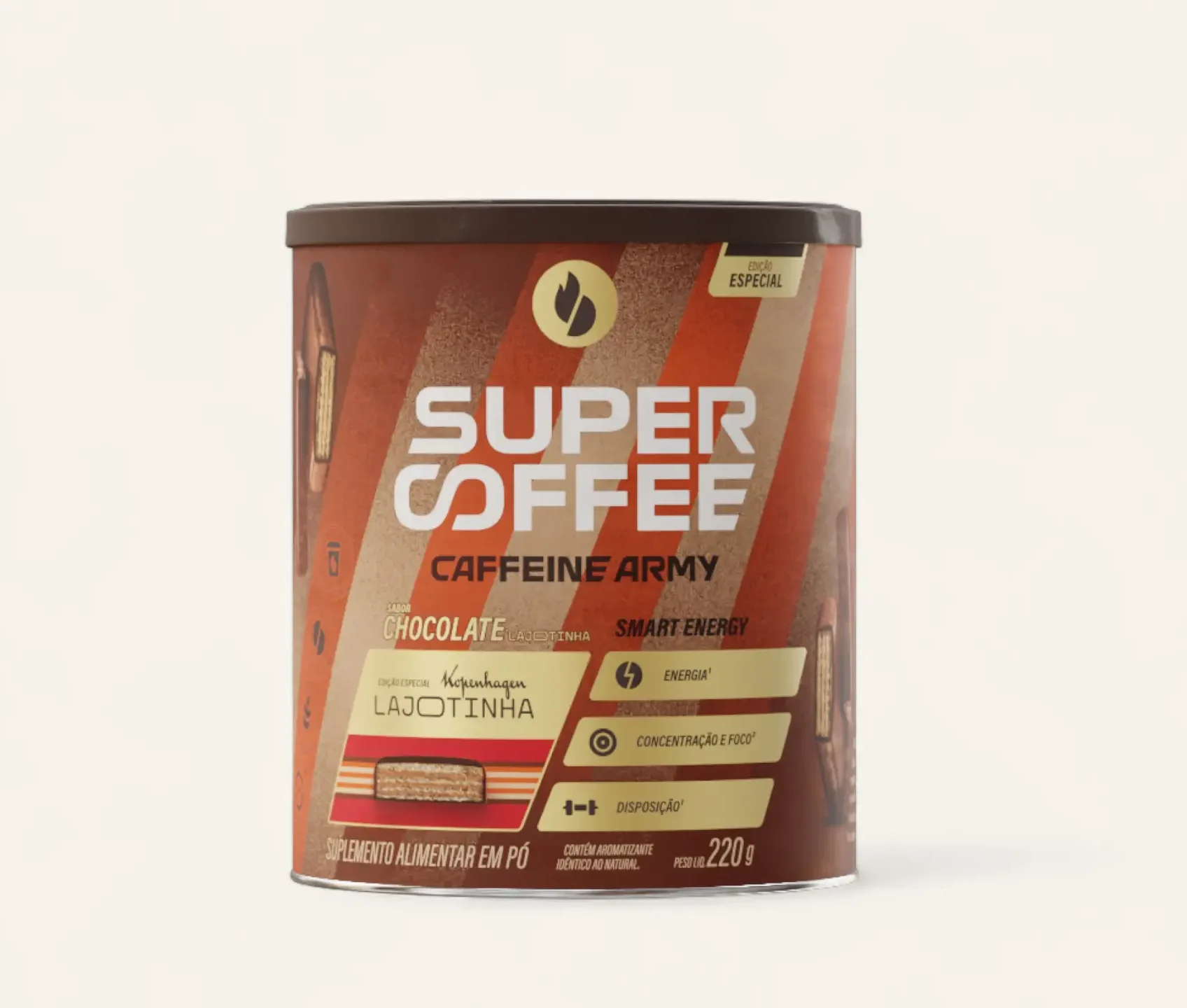O SuperCoffee Lajotinha – Caffeine Army é uma bebida funcional saborosa e energética, inspirada no clássico doce brasileiro. Sua fórmula combina café premium, TCM, colágeno, taurina, L-teanina, adaptógenos e vitaminas, criando um blend completo para aumentar energia, foco, disposição e performance ao longo do dia. Com sabor cremoso que lembra amendoim com chocolate, é zero adição de açúcar, prático e ideal para usar no pré-treino, no trabalho ou sempre que precisar de um impulso de produtividade sem abrir mão de um sabor delicioso.
