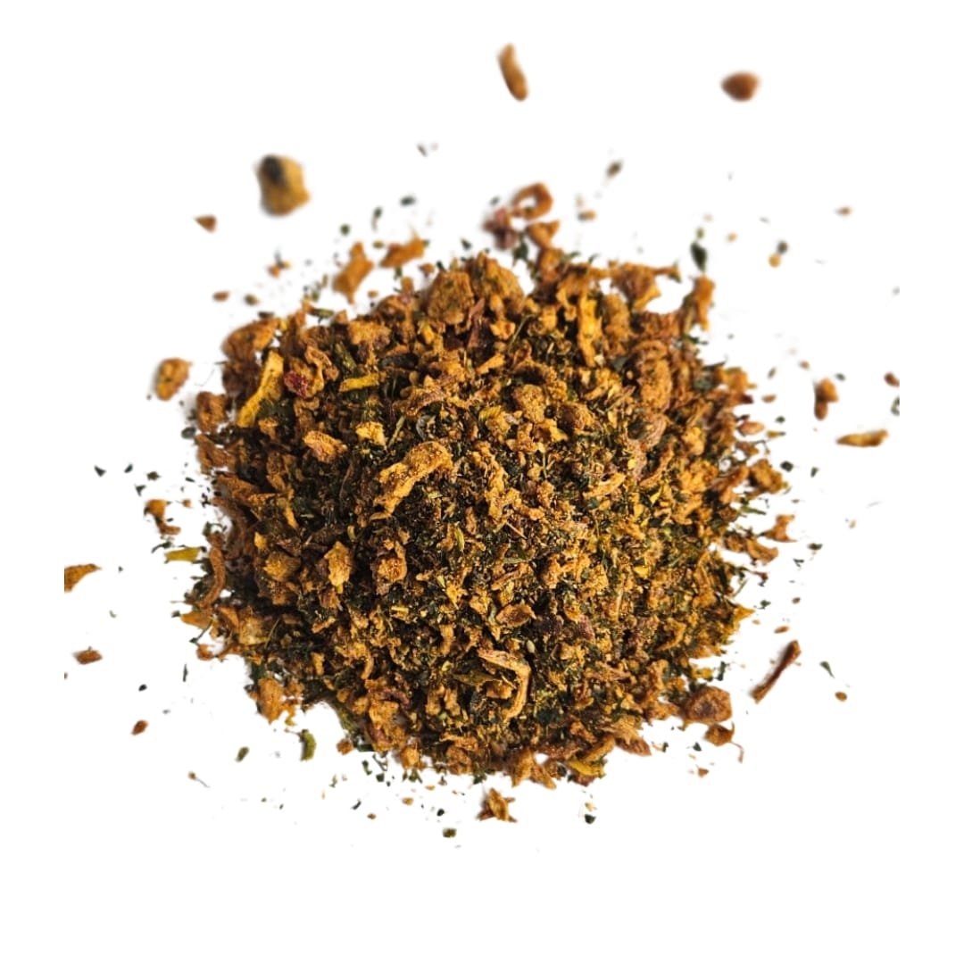 Sal, alho granulado, cebola desidratada, salsa, orégano, manjericão, louro, cebolinha, açafrão, páprica doce, alecrim e cominho.